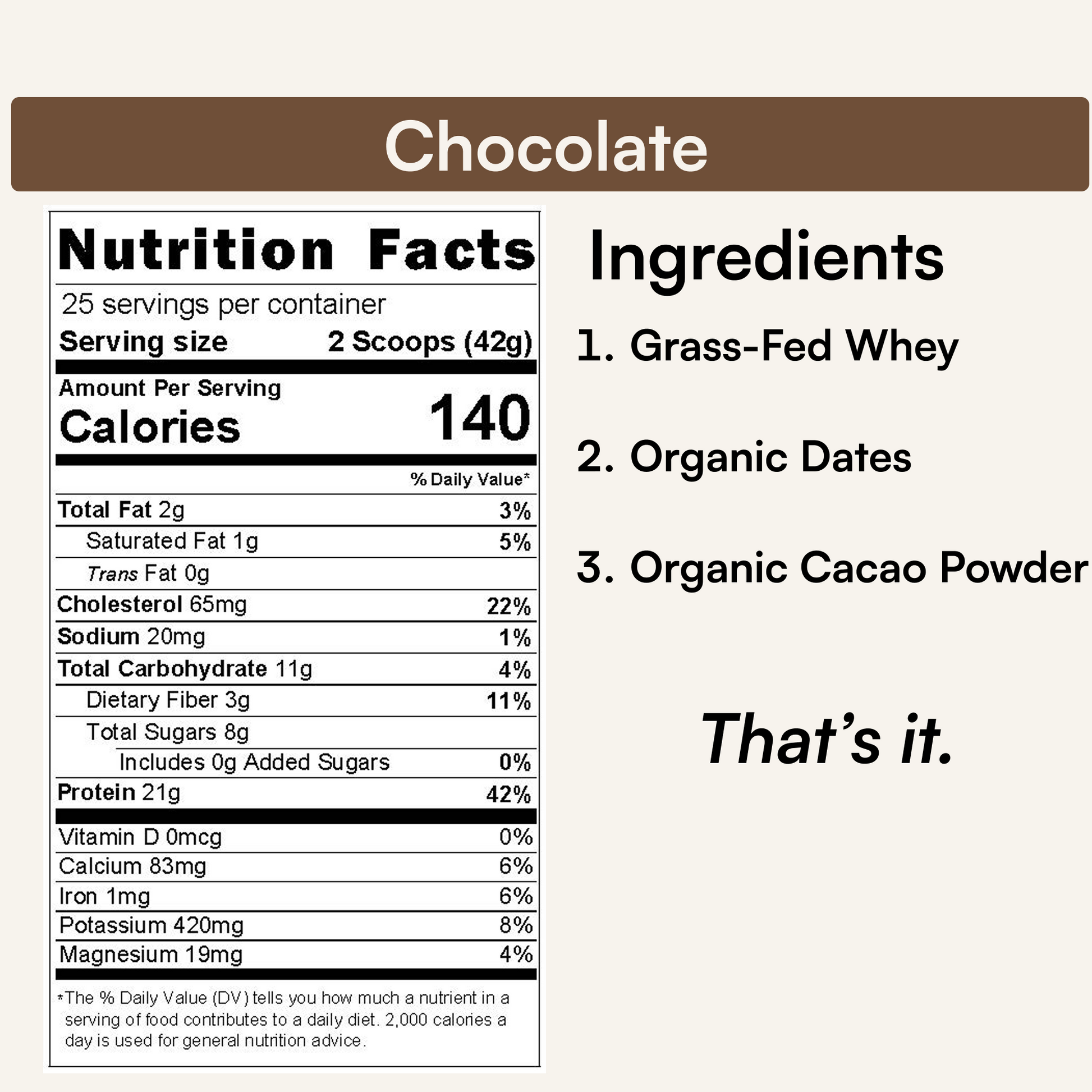 Chocolate: Grass-Fed Whey Protein Concentrate, Organic Dates, Organic Cacao